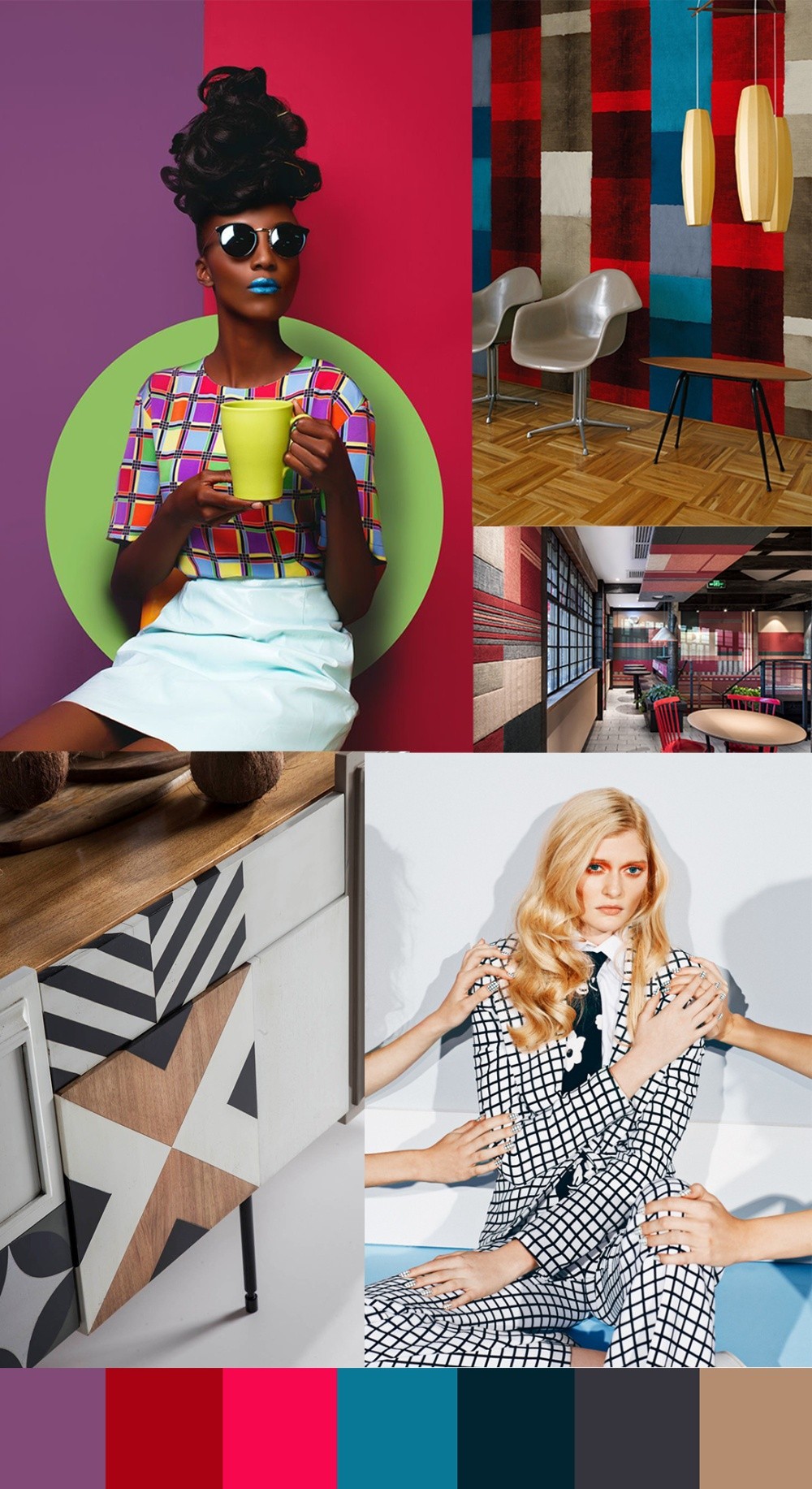 它的色彩變得更豐富,而且幾何的形狀也可以進行大小的對比,整個視覺相比棋盤格色彩更豐富,格紋的形式更動態有趣。